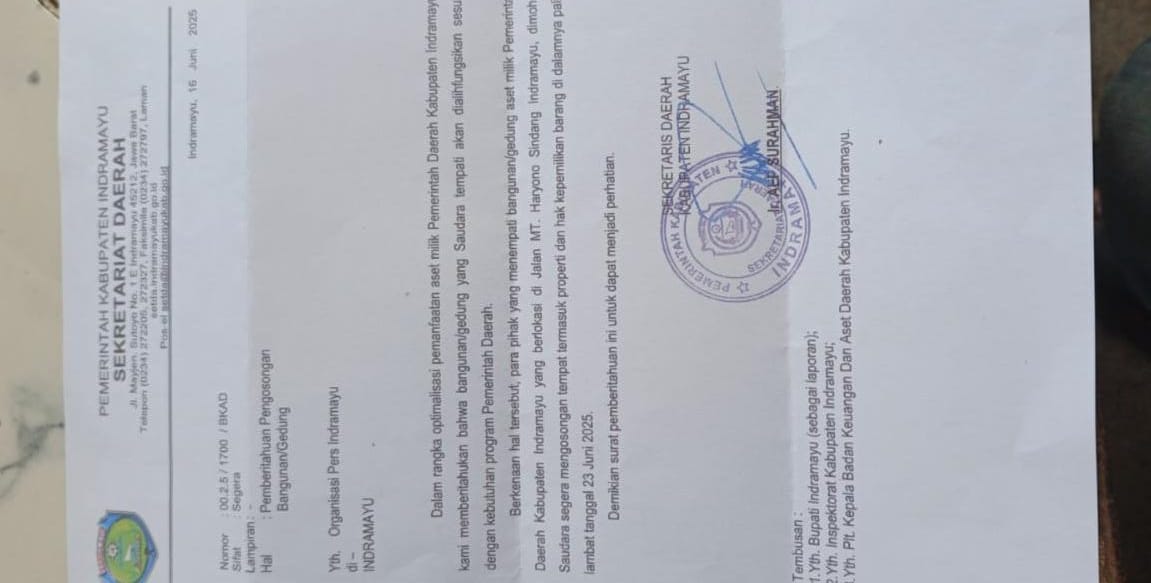 Surat tersebut berisi permintaan pengosongan gedung Graha Pers Indramayu (GPI) yang selama ini digunakan oleh Organisasi Pers Indramayu, dengan alasan bangunan tersebut merupakan aset milik Pemerintah Kabupaten dan akan dialihfungsikan untuk program pemda.