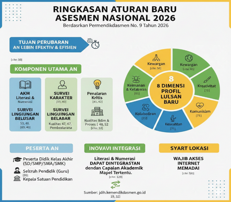 Dengan regulasi baru ini, pemerintah berharap penyelenggaraan Asesmen Nasional semakin akurat, terintegrasi, dan mampu menjadi dasar perbaikan mutu pendidikan secara berkelanjutan di seluruh Indonesia.